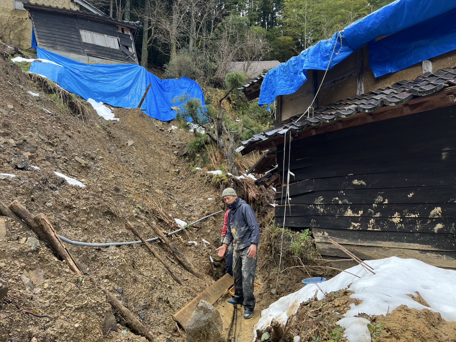 重機チームは晴れ間を縫って家裏からの土砂撤去。