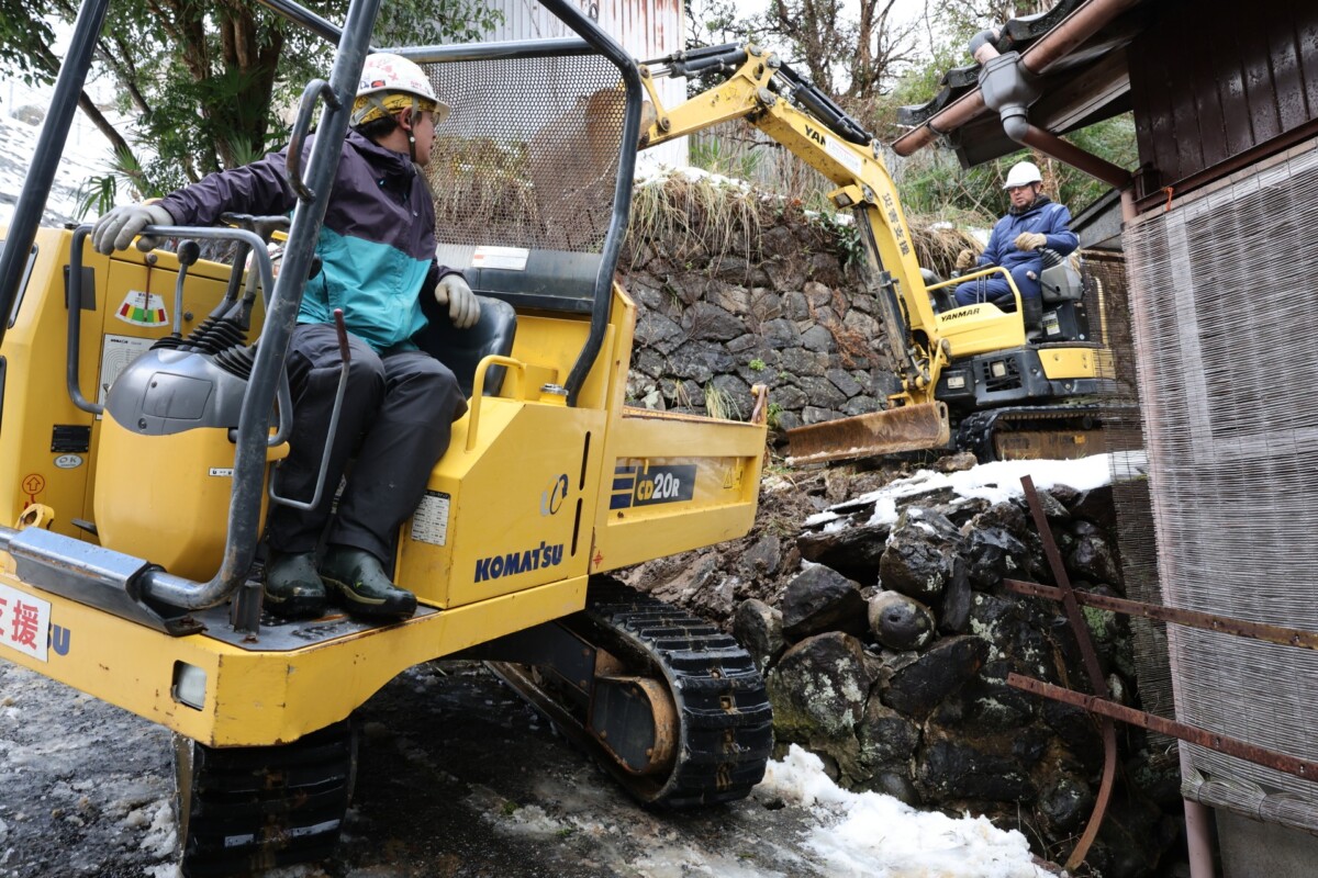 雪が落ち着くと重機隊は地震と長雨でゆるんだ石垣の撤去活動に着手しました。
