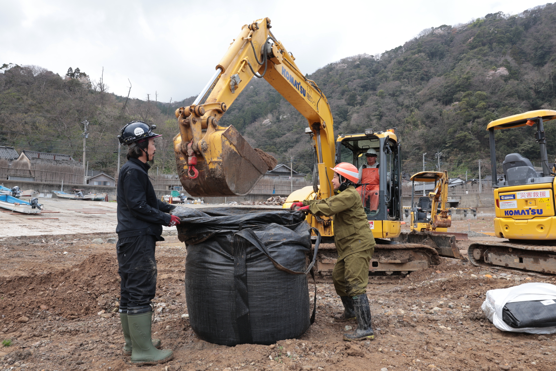 重機現場では土嚢運びなどの力仕事に若い力が大活躍でした。