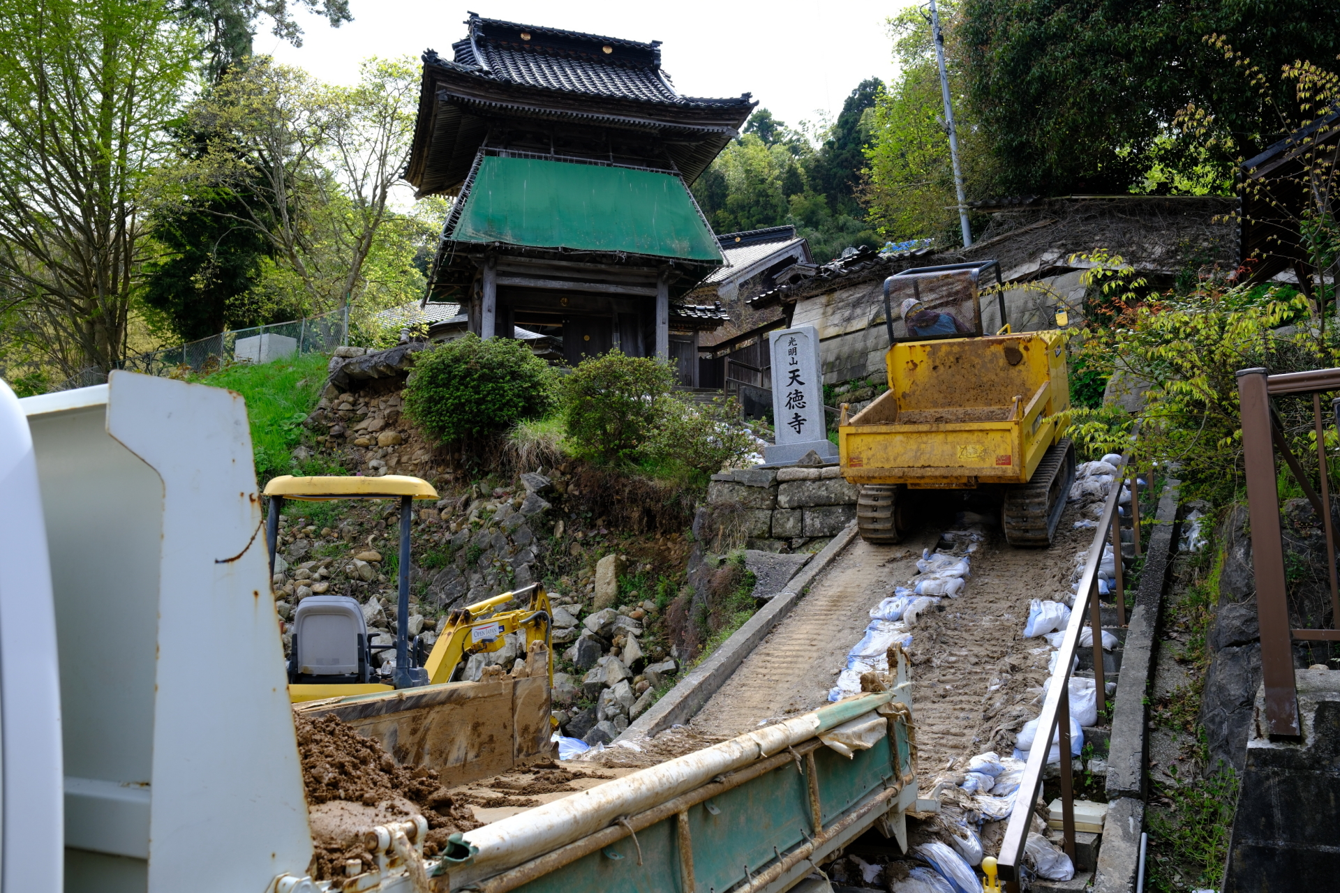 慎重に崩れた個所を撤去しながら急な坂道を不整地運搬車を使用して土砂を運び出していきます。