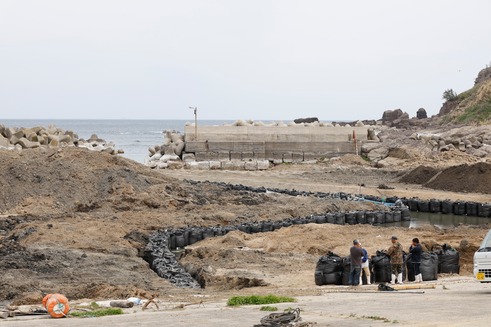 地震で隆起したあとに豪雨で山からの土砂が流れ込み堆積してしまった漁港。