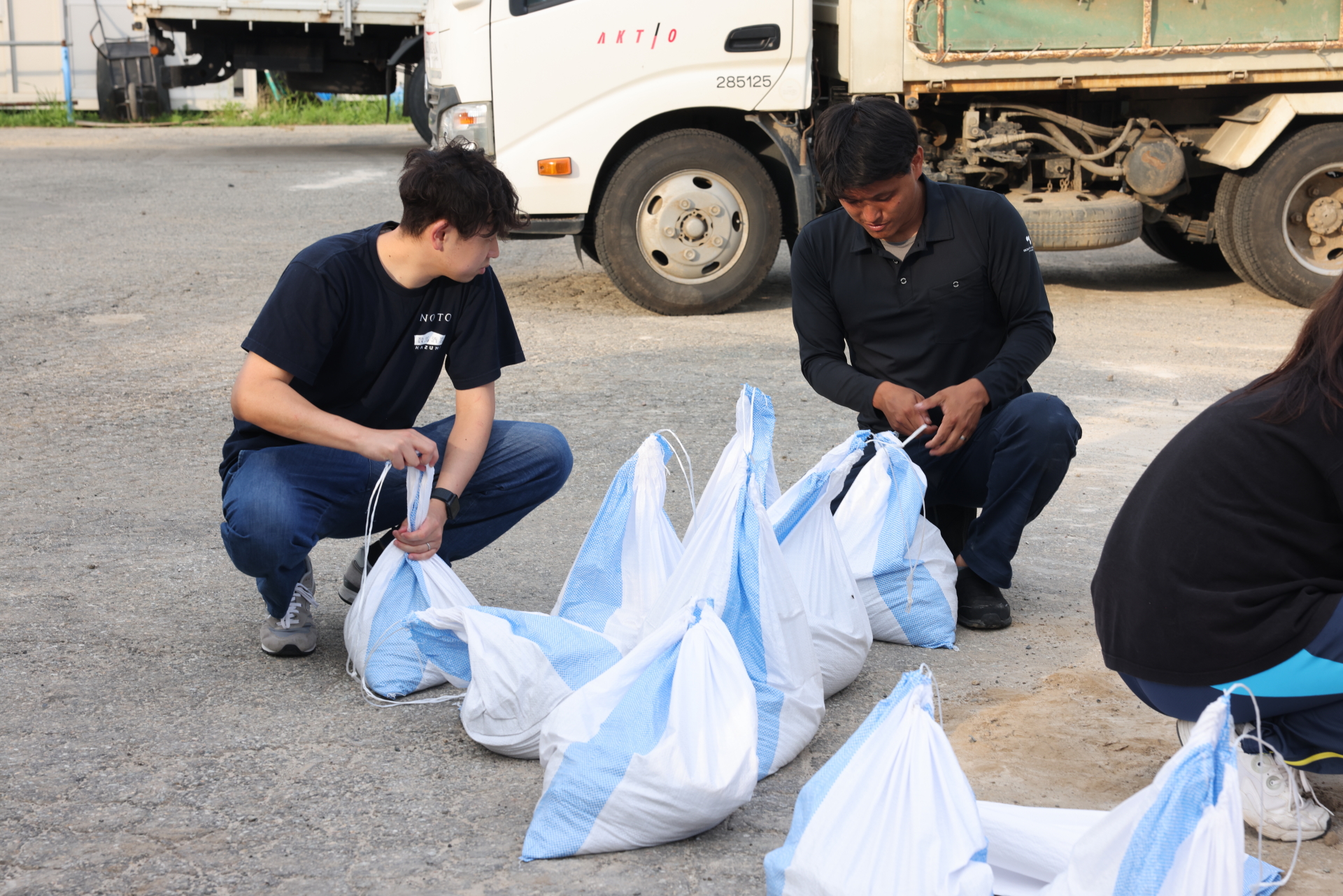 地元の新村新友会のみなさんと水防土のうを作って町中に設置しました。
